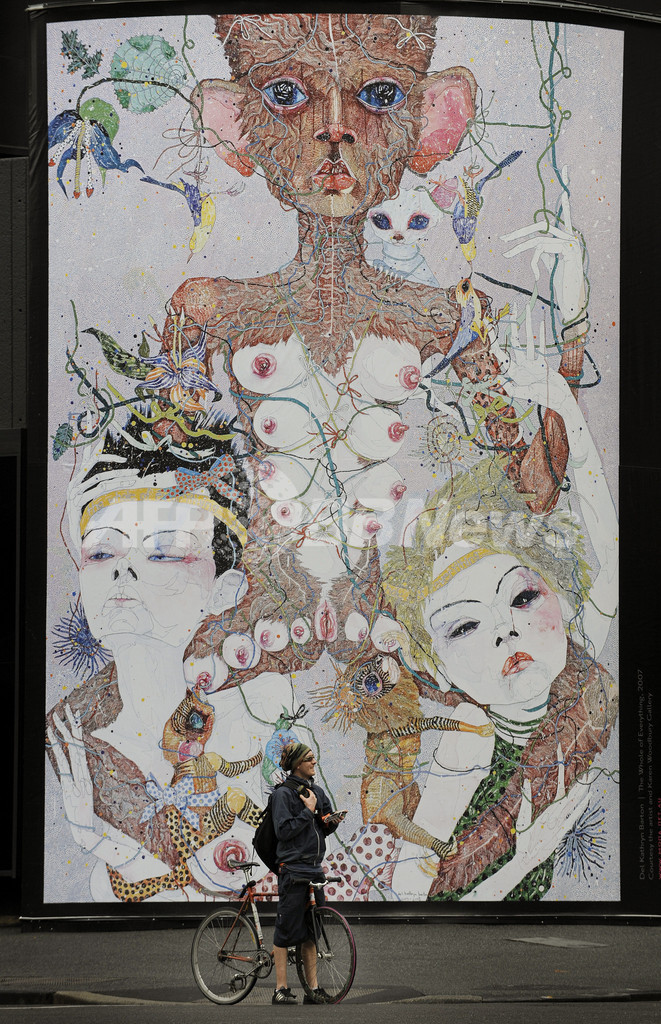 これはオーストラリア人アーティストDel Kathryn Bartonさんの手による作品で、タイトルは「The Whole of Everything(なにもかもすべて)」。脚を広げた、多数の乳房を持つ女性が描かれているが、地元で「ポルノと芸術」についての議論を巻き起こしてはいないという。交差点に面したこのアパートの壁面は、現代アートの展示スペースを提供している。(c)AFP