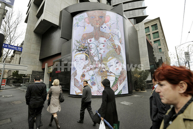 これはオーストラリア人アーティストDel Kathryn Bartonさんの手による作品で、タイトルは「The Whole of Everything(なにもかもすべて)」。脚を広げた、多数の乳房を持つ女性が描かれているが、地元で「ポルノと芸術」についての議論を巻き起こしてはいないという。交差点に面したこのアパートの壁面は、現代アートの展示スペースを提供している。(c)AFP
