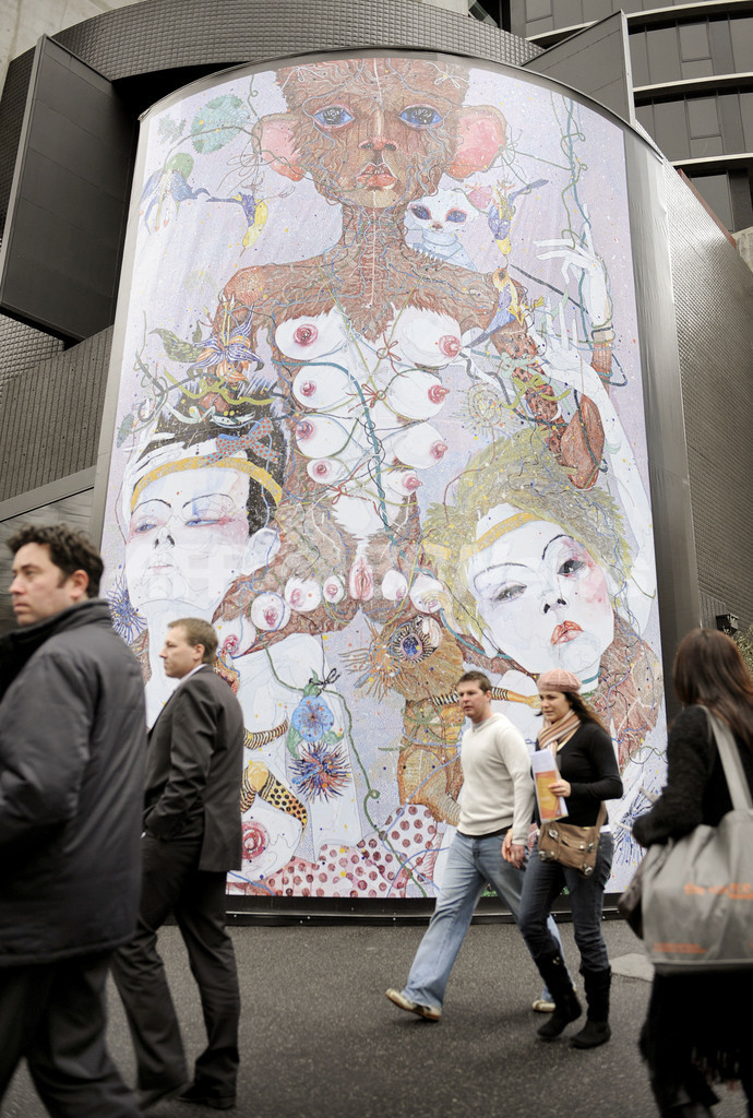 これはオーストラリア人アーティストDel Kathryn Bartonさんの手による作品で、タイトルは「The Whole of Everything(なにもかもすべて)」。脚を広げた、多数の乳房を持つ女性が描かれているが、地元で「ポルノと芸術」についての議論を巻き起こしてはいないという。交差点に面したこのアパートの壁面は、現代アートの展示スペースを提供している。(c)AFP