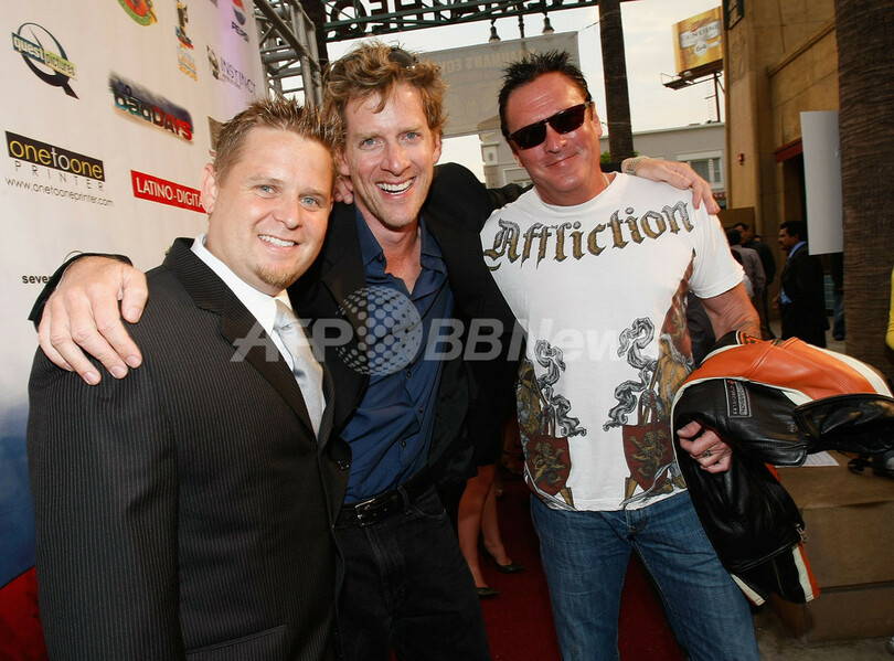 ロサンゼルス(Los Angeles)のエジプシャン・シアター(Egyptian Theater)で開催された映画『No Bad Days』の上映会に登場した(左から)監督のDavid Murphy、プロデューサーのデクラン・ジョイス(Declan Joyce)、出演俳優のマイケル・マドセン(Michael Madsen(2008年7月8日撮影)。(c)AFP/Getty Images/Michael Buckner