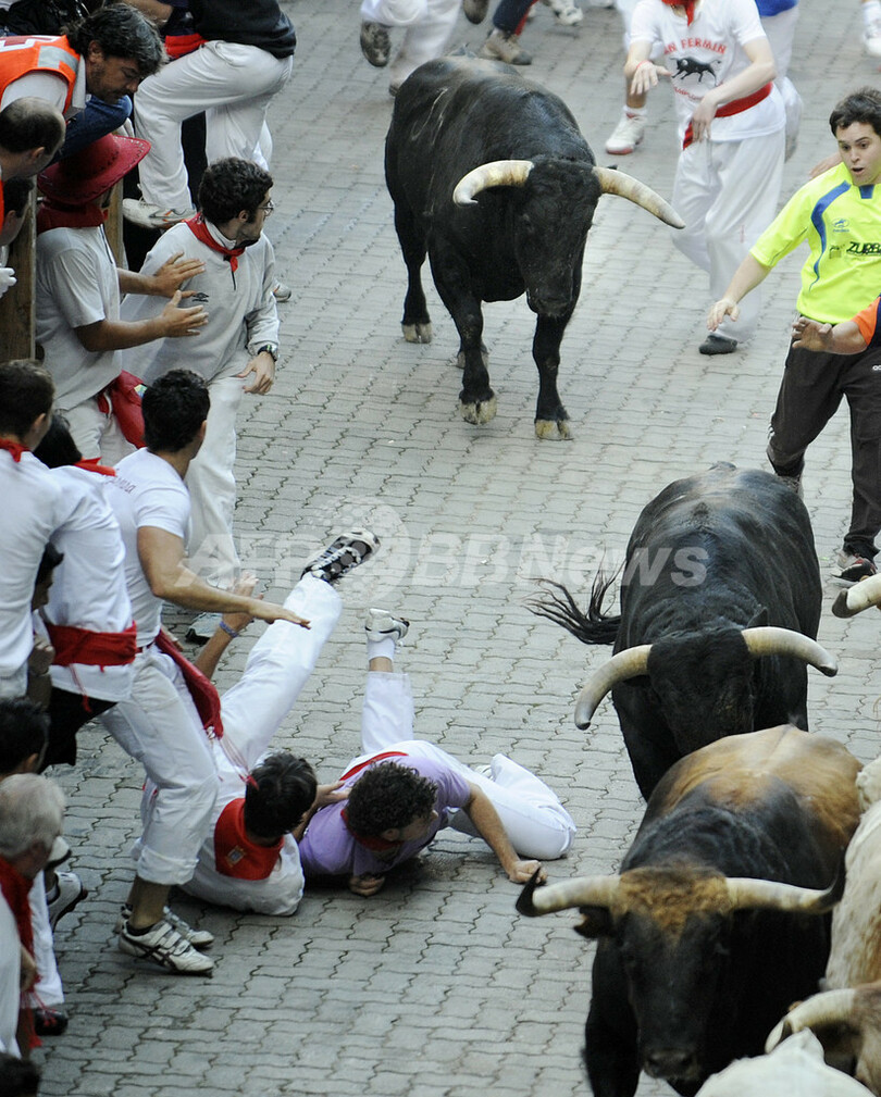【7月11日 AFP】(12日 写真追加)スペイン北部パンプロナ(Pamplona)のサン・フェルミン祭(San Fermin Fair)で7日から始まった恒例の牛追い祭は5日目を迎えた11日も、定刻通り午前8時にスタート。街は熱気に包まれた。