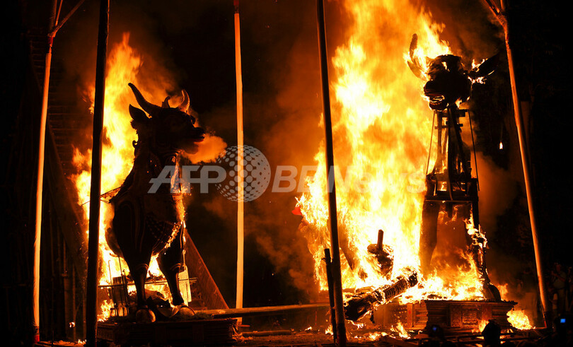 ニュース ライフ バリ島史上最大規模の王族火葬儀礼 2008年7月16日 10:10 発信地:バリ島/インドネシア [ アジア・オセアニア インドネシア ] このニュースをシェア ‹ › ❮ 9/11 ❯ インドネシア・バリ島(Bali island)のウブド(Ubud)で黒い牛の飾りが付いたひつぎに収められている王族の遺体の火葬儀礼(2008年7月15日撮影)。(c)AFP/Bay ISMOYO 画像作成中 ! 【7月16日 AFP】インドネシア・バリ島(Bali island)のウブド(Ubud)で15日、バリ島史上最大規模とされる王族の遺体の火葬儀礼が行われた。この儀式はガベン(Ngaben)と呼ばれる集団火葬儀礼で、約25万人の臣下たちが見守る中、黒い牛の飾りの付いた棺に入った遺体2体が荼毘(だび)に付された。(c)AFP ライフ 一覧へ> メディア・報道関係・法人の方向け 写真・動画 購入のお問合せ>