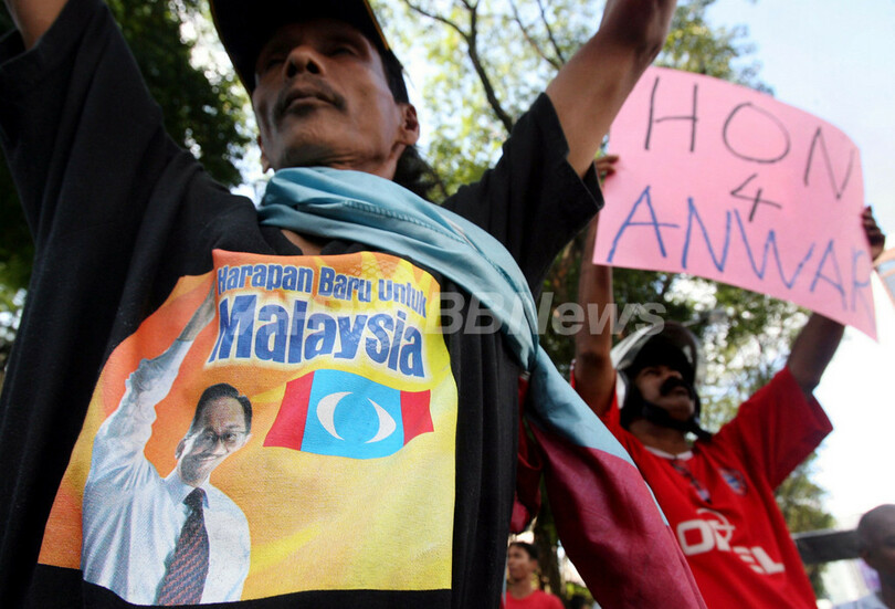 アンワル氏には事務所でボランティアをしていた23歳の元側近と同性愛行為をした容疑がかけられている。アンワル氏側は、3月の選挙で野党が前例のない大勝利を収めたことから、アンワル氏が政権を握るのを阻止しようとする政府の陰謀だと主張している。(c)AFP