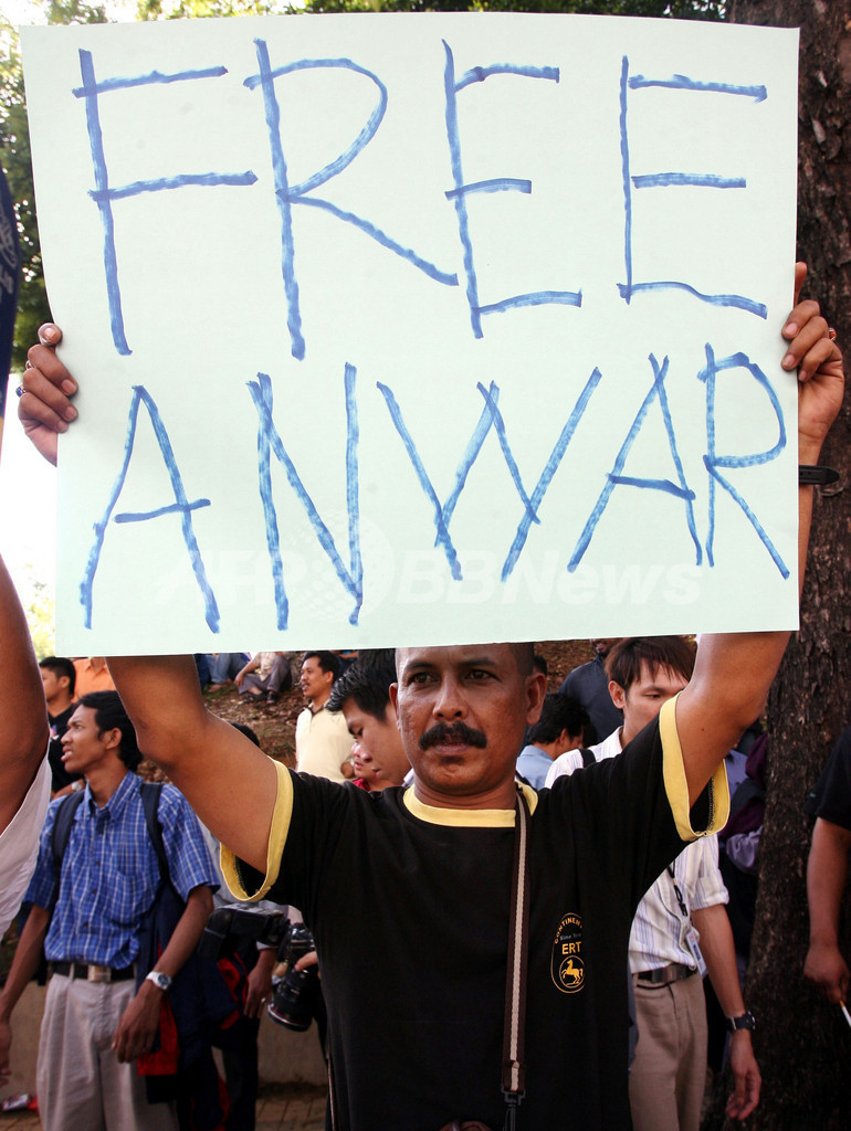 アンワル氏には事務所でボランティアをしていた23歳の元側近と同性愛行為をした容疑がかけられている。アンワル氏側は、3月の選挙で野党が前例のない大勝利を収めたことから、アンワル氏が政権を握るのを阻止しようとする政府の陰謀だと主張している。(c)AFP