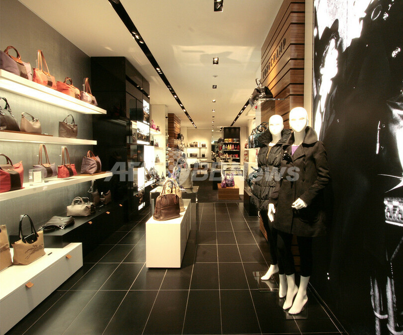 ホワイト、シルバー、ブラックを基調にした、ミニマルでシャープなインテリア。ゼブラウッドがアクセントのグラフィカルでモダンな雰囲気の中に、ケイト・モス(Kate Moss)を起用したADキャンペーンビジュアルが配されている。フランスから取り寄せられたメッシュアルミを使用した壁面や、レザーのプルノブをつけた家具など、細部にまでこだわったブティックは、ロンシャンの物づくりへのこだわりを感じさせるつくりになっている。