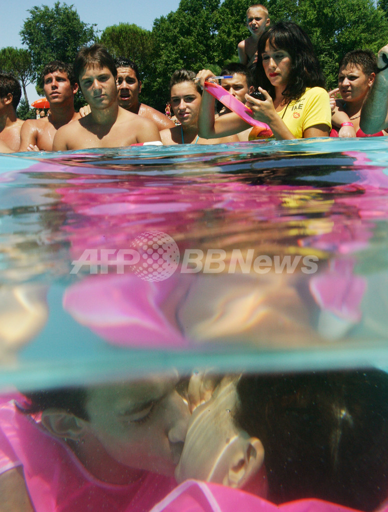 【7月21日 AFP】イタリアのリッチョーネ(Riccione)で20日、水中キス国際大会「International Underwater Kissing Contest」が開かれ、イタリア人のクラウディア・ペッタツオーニ(Claudia Pettazzoni)さんとペルー人のフィデル・リオス(Fidel Rios)さんのカップルが1分51秒という水中キスの世界最長記録を達成し、優勝した。(c)AFP