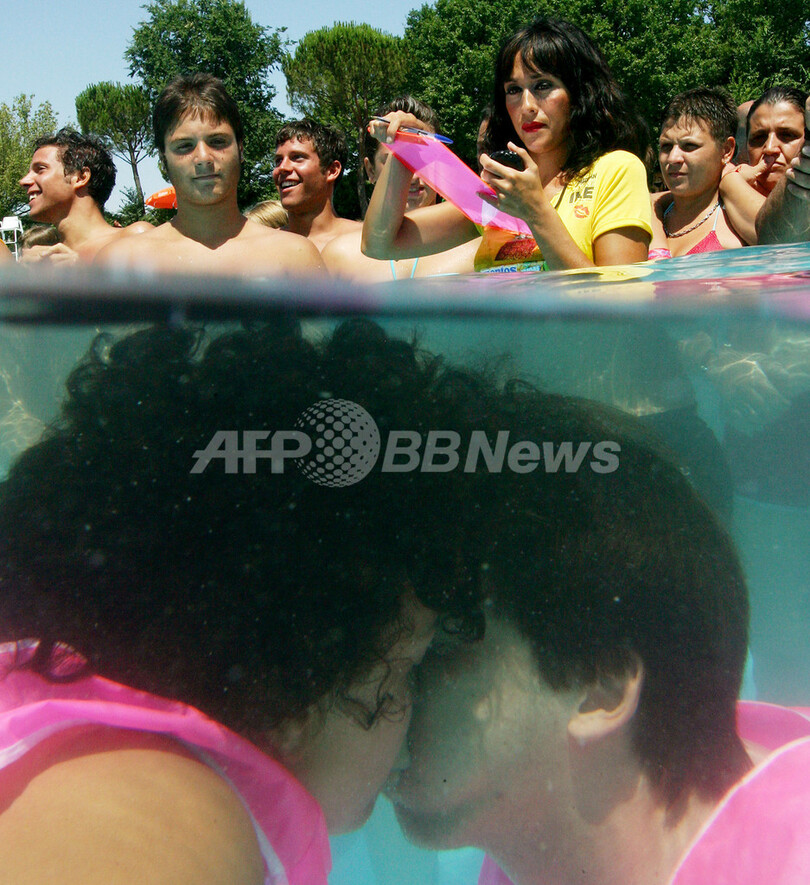 【7月21日 AFP】イタリアのリッチョーネ(Riccione)で20日、水中キス国際大会「International Underwater Kissing Contest」が開かれ、イタリア人のクラウディア・ペッタツオーニ(Claudia Pettazzoni)さんとペルー人のフィデル・リオス(Fidel Rios)さんのカップルが1分51秒という水中キスの世界最長記録を達成し、優勝した。(c)AFP
