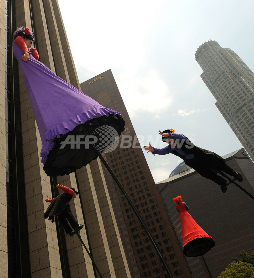 【7月21日 AFP】カリフォルニア(California)州ロサンゼルス(Los Angeles)市内中心部の広場でパフォーマンスを披露する空中パフォーマンス劇団「ストレンジ・フルーツ(Strange Fruit)」。オーストラリア・メルボルン(Melbourne)を拠点とするこの劇団のパフォーマンスは、高さ4メートルのポールの上で行われるのが特徴。演劇と舞踊、曲技を織り交ぜたパフォーマンス作品を通じて、愛や対立、誕生、死、仕事や遊びといった普遍的なテーマを表現している。現在、米公演中。(c)AFP