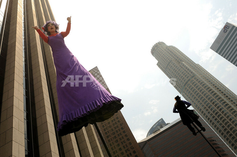 【7月21日 AFP】カリフォルニア(California)州ロサンゼルス(Los Angeles)市内中心部の広場でパフォーマンスを披露する空中パフォーマンス劇団「ストレンジ・フルーツ(Strange Fruit)」。オーストラリア・メルボルン(Melbourne)を拠点とするこの劇団のパフォーマンスは、高さ4メートルのポールの上で行われるのが特徴。演劇と舞踊、曲技を織り交ぜたパフォーマンス作品を通じて、愛や対立、誕生、死、仕事や遊びといった普遍的なテーマを表現している。現在、米公演中。(c)AFP