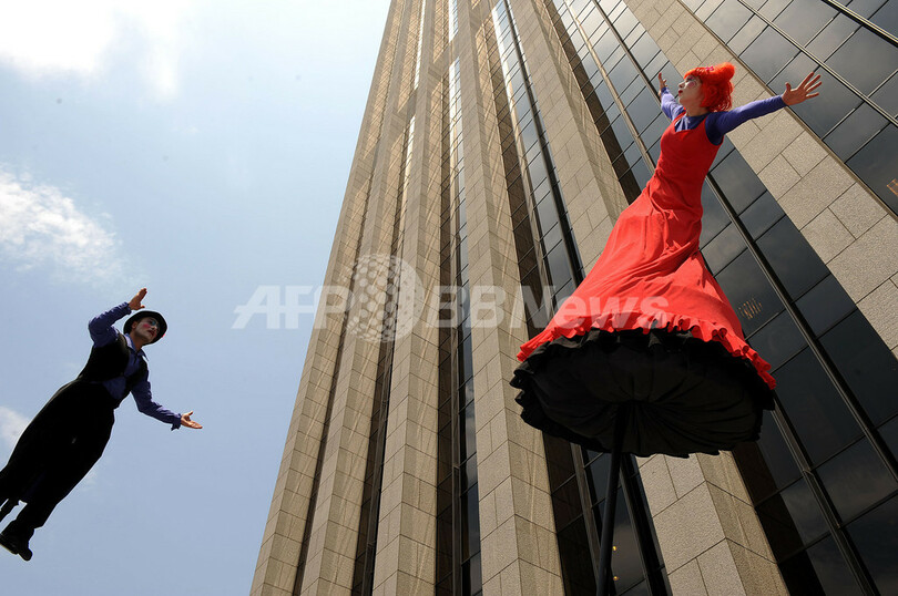 【7月21日 AFP】カリフォルニア(California)州ロサンゼルス(Los Angeles)市内中心部の広場でパフォーマンスを披露する空中パフォーマンス劇団「ストレンジ・フルーツ(Strange Fruit)」。オーストラリア・メルボルン(Melbourne)を拠点とするこの劇団のパフォーマンスは、高さ4メートルのポールの上で行われるのが特徴。演劇と舞踊、曲技を織り交ぜたパフォーマンス作品を通じて、愛や対立、誕生、死、仕事や遊びといった普遍的なテーマを表現している。現在、米公演中。(c)AFP