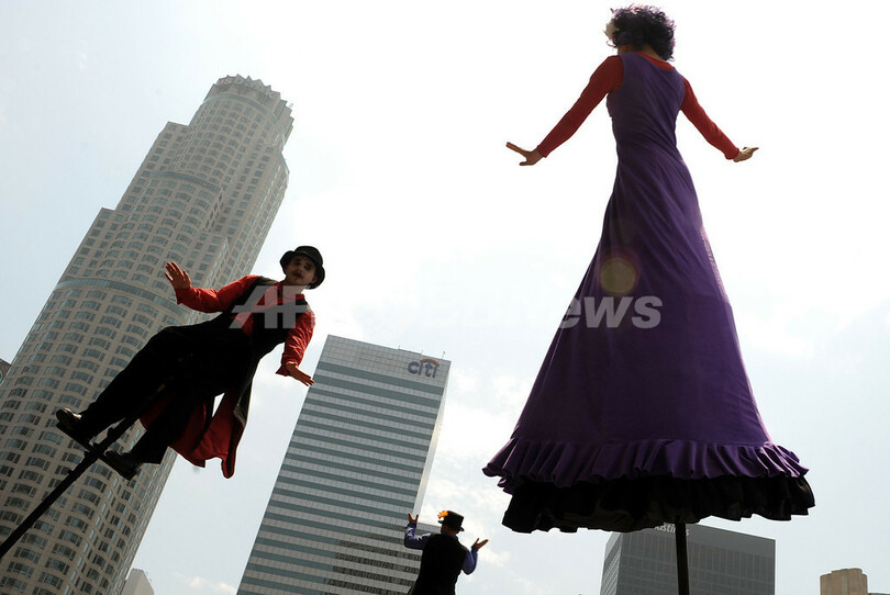 【7月21日 AFP】カリフォルニア(California)州ロサンゼルス(Los Angeles)市内中心部の広場でパフォーマンスを披露する空中パフォーマンス劇団「ストレンジ・フルーツ(Strange Fruit)」。オーストラリア・メルボルン(Melbourne)を拠点とするこの劇団のパフォーマンスは、高さ4メートルのポールの上で行われるのが特徴。演劇と舞踊、曲技を織り交ぜたパフォーマンス作品を通じて、愛や対立、誕生、死、仕事や遊びといった普遍的なテーマを表現している。現在、米公演中。(c)AFP