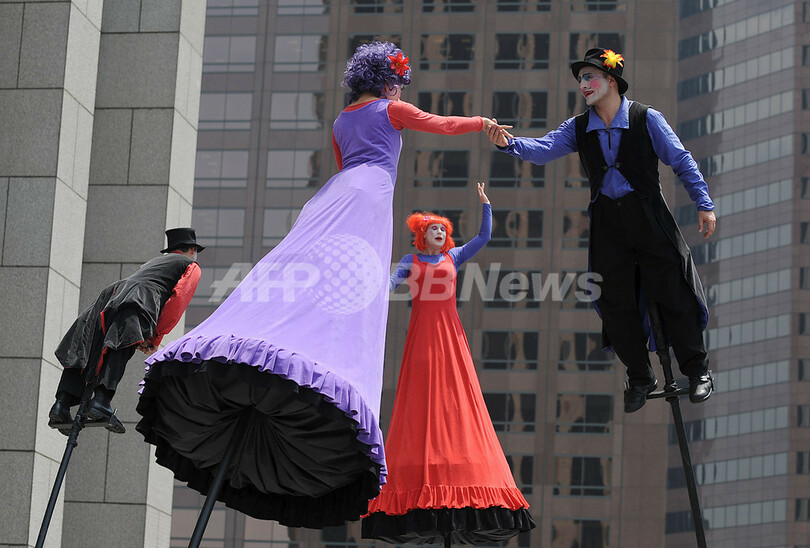 【7月21日 AFP】カリフォルニア(California)州ロサンゼルス(Los Angeles)市内中心部の広場でパフォーマンスを披露する空中パフォーマンス劇団「ストレンジ・フルーツ(Strange Fruit)」。オーストラリア・メルボルン(Melbourne)を拠点とするこの劇団のパフォーマンスは、高さ4メートルのポールの上で行われるのが特徴。演劇と舞踊、曲技を織り交ぜたパフォーマンス作品を通じて、愛や対立、誕生、死、仕事や遊びといった普遍的なテーマを表現している。現在、米公演中。(c)AFP