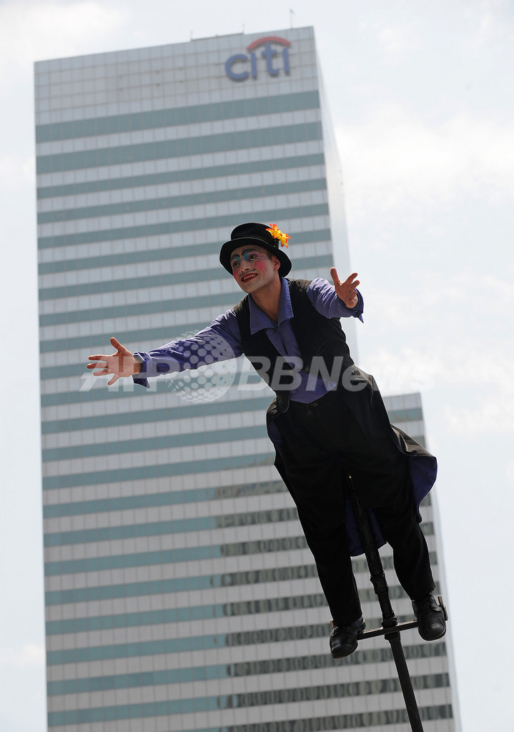 【7月21日 AFP】カリフォルニア(California)州ロサンゼルス(Los Angeles)市内中心部の広場でパフォーマンスを披露する空中パフォーマンス劇団「ストレンジ・フルーツ(Strange Fruit)」。オーストラリア・メルボルン(Melbourne)を拠点とするこの劇団のパフォーマンスは、高さ4メートルのポールの上で行われるのが特徴。演劇と舞踊、曲技を織り交ぜたパフォーマンス作品を通じて、愛や対立、誕生、死、仕事や遊びといった普遍的なテーマを表現している。現在、米公演中。(c)AFP