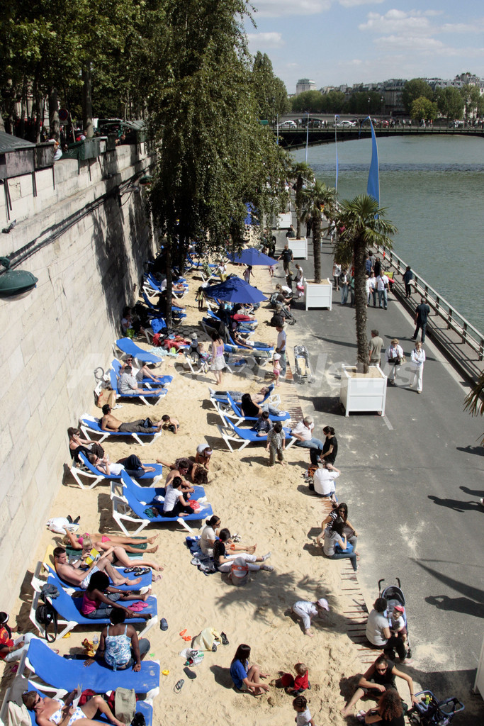 このイベントは、セーヌ川の川岸を3キロにわたり、数週間ヤシの木と砂で人工の浜辺にするというもの。2002年に始まり、今年で7年目を迎える。毎年400万人に上る来場者が集まり、日光浴や無料コンサート、スポーツなどのイベントを楽しむ。(c)AFP