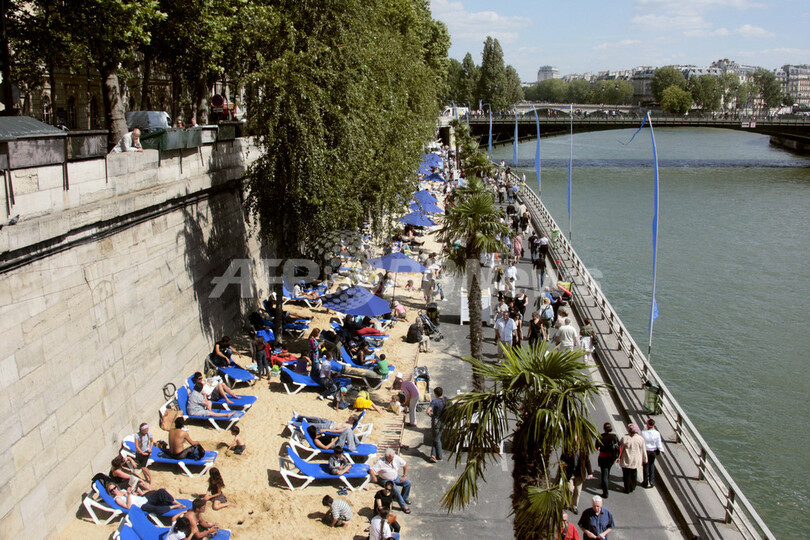 このイベントは、セーヌ川の川岸を3キロにわたり、数週間ヤシの木と砂で人工の浜辺にするというもの。2002年に始まり、今年で7年目を迎える。毎年400万人に上る来場者が集まり、日光浴や無料コンサート、スポーツなどのイベントを楽しむ。(c)AFP