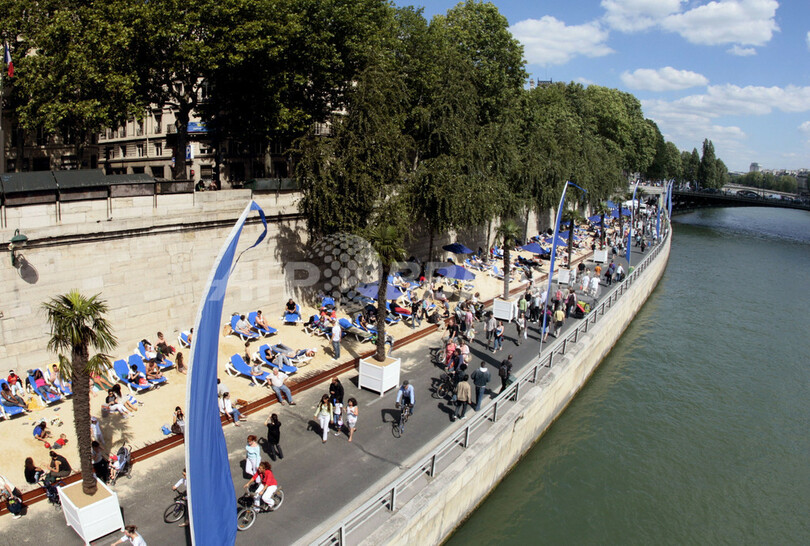 このイベントは、セーヌ川の川岸を3キロにわたり、数週間ヤシの木と砂で人工の浜辺にするというもの。2002年に始まり、今年で7年目を迎える。毎年400万人に上る来場者が集まり、日光浴や無料コンサート、スポーツなどのイベントを楽しむ。(c)AFP