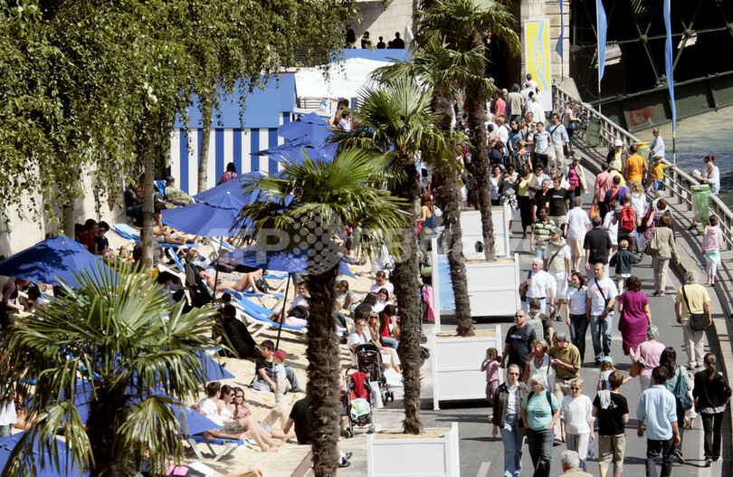 このイベントは、セーヌ川の川岸を3キロにわたり、数週間ヤシの木と砂で人工の浜辺にするというもの。2002年に始まり、今年で7年目を迎える。毎年400万人に上る来場者が集まり、日光浴や無料コンサート、スポーツなどのイベントを楽しむ。(c)AFP