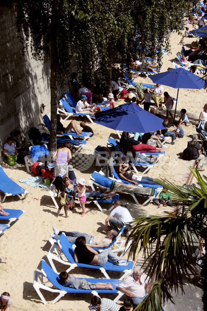このイベントは、セーヌ川の川岸を3キロにわたり、数週間ヤシの木と砂で人工の浜辺にするというもの。2002年に始まり、今年で7年目を迎える。毎年400万人に上る来場者が集まり、日光浴や無料コンサート、スポーツなどのイベントを楽しむ。(c)AFP