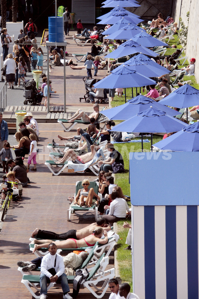 このイベントは、セーヌ川の川岸を3キロにわたり、数週間ヤシの木と砂で人工の浜辺にするというもの。2002年に始まり、今年で7年目を迎える。毎年400万人に上る来場者が集まり、日光浴や無料コンサート、スポーツなどのイベントを楽しむ。(c)AFP