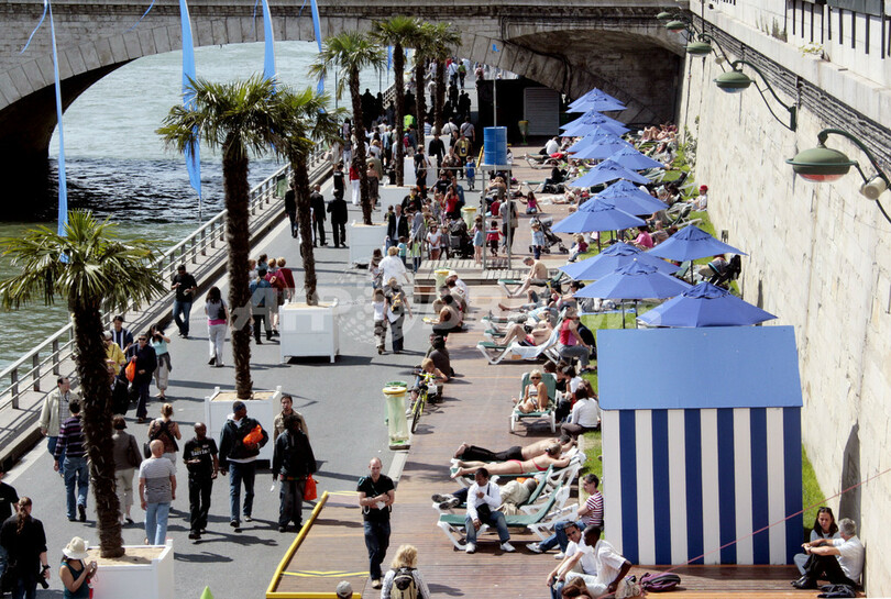このイベントは、セーヌ川の川岸を3キロにわたり、数週間ヤシの木と砂で人工の浜辺にするというもの。2002年に始まり、今年で7年目を迎える。毎年400万人に上る来場者が集まり、日光浴や無料コンサート、スポーツなどのイベントを楽しむ。(c)AFP