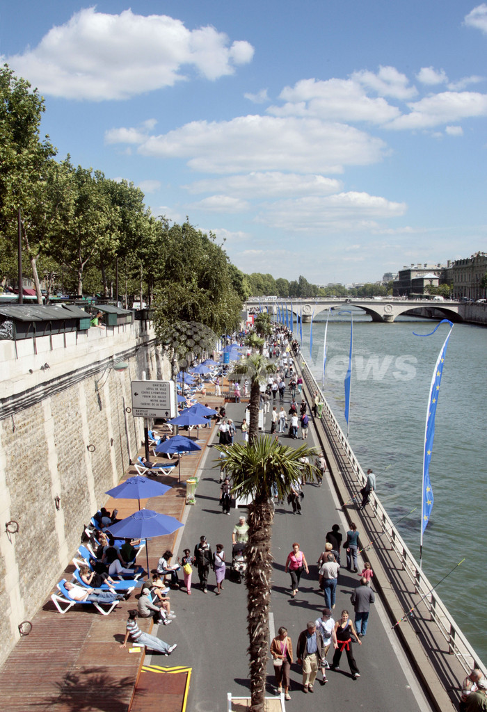 このイベントは、セーヌ川の川岸を3キロにわたり、数週間ヤシの木と砂で人工の浜辺にするというもの。2002年に始まり、今年で7年目を迎える。毎年400万人に上る来場者が集まり、日光浴や無料コンサート、スポーツなどのイベントを楽しむ。(c)AFP
