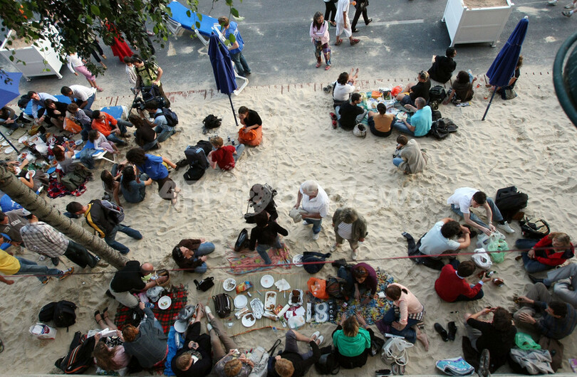 このイベントは、セーヌ川の川岸を3キロにわたり、数週間ヤシの木と砂で人工の浜辺にするというもの。2002年に始まり、今年で7年目を迎える。毎年400万人に上る来場者が集まり、日光浴や無料コンサート、スポーツなどのイベントを楽しむ。(c)AFP