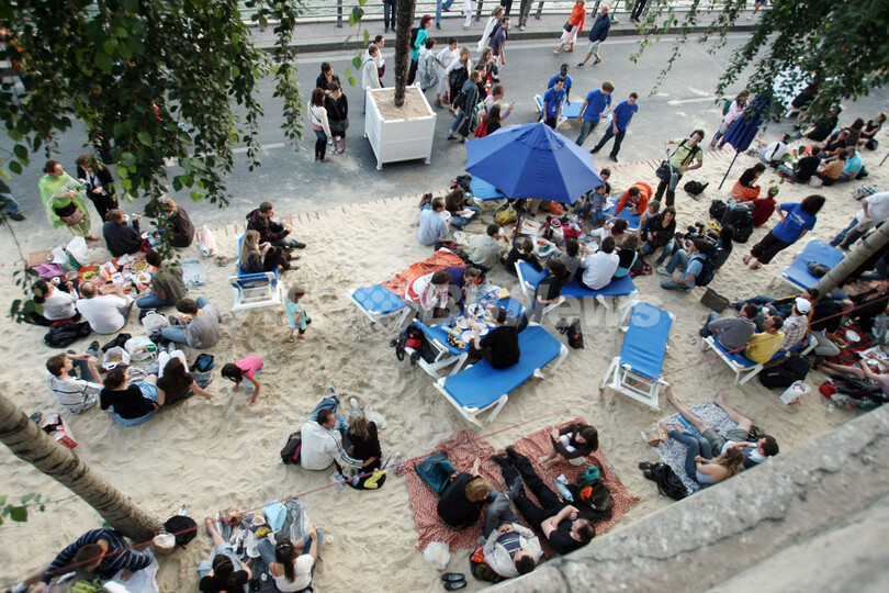 このイベントは、セーヌ川の川岸を3キロにわたり、数週間ヤシの木と砂で人工の浜辺にするというもの。2002年に始まり、今年で7年目を迎える。毎年400万人に上る来場者が集まり、日光浴や無料コンサート、スポーツなどのイベントを楽しむ。(c)AFP