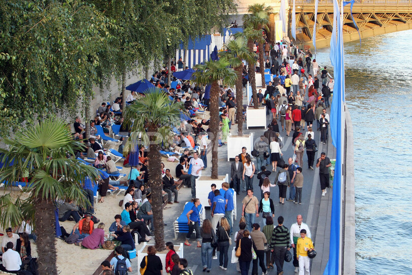 このイベントは、セーヌ川の川岸を3キロにわたり、数週間ヤシの木と砂で人工の浜辺にするというもの。2002年に始まり、今年で7年目を迎える。毎年400万人に上る来場者が集まり、日光浴や無料コンサート、スポーツなどのイベントを楽しむ。(c)AFP
