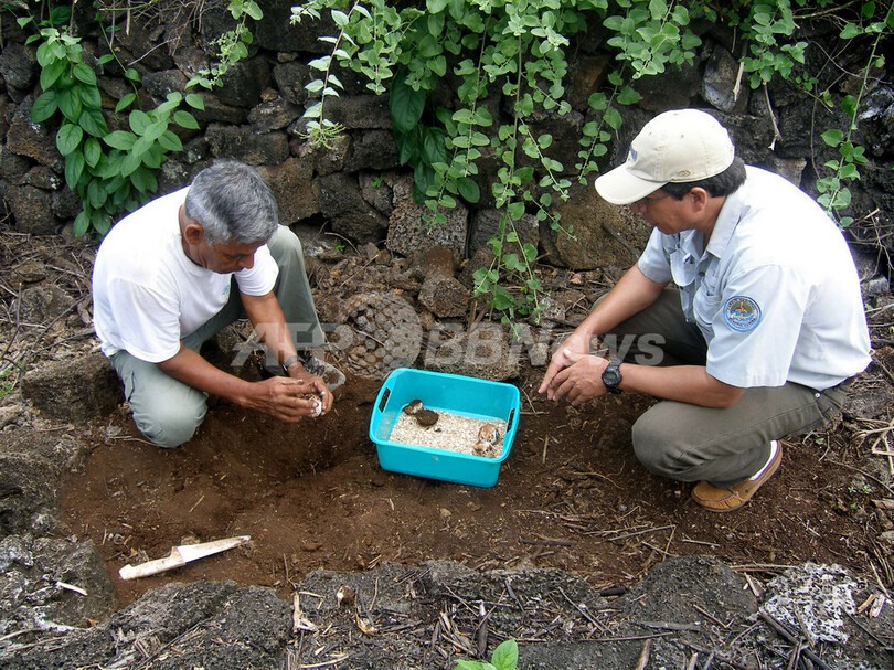 ロンサム・ジョージに繁殖活動をさせる試みが過去36年にわたり行われていたが、これまで卵が産まれたことはなかった。ところが研究所の関係者は21日、現在ジョージとのペアリングが試みられている雌のカメとの巣に9個の卵があるのを発見したという。(c)AFP