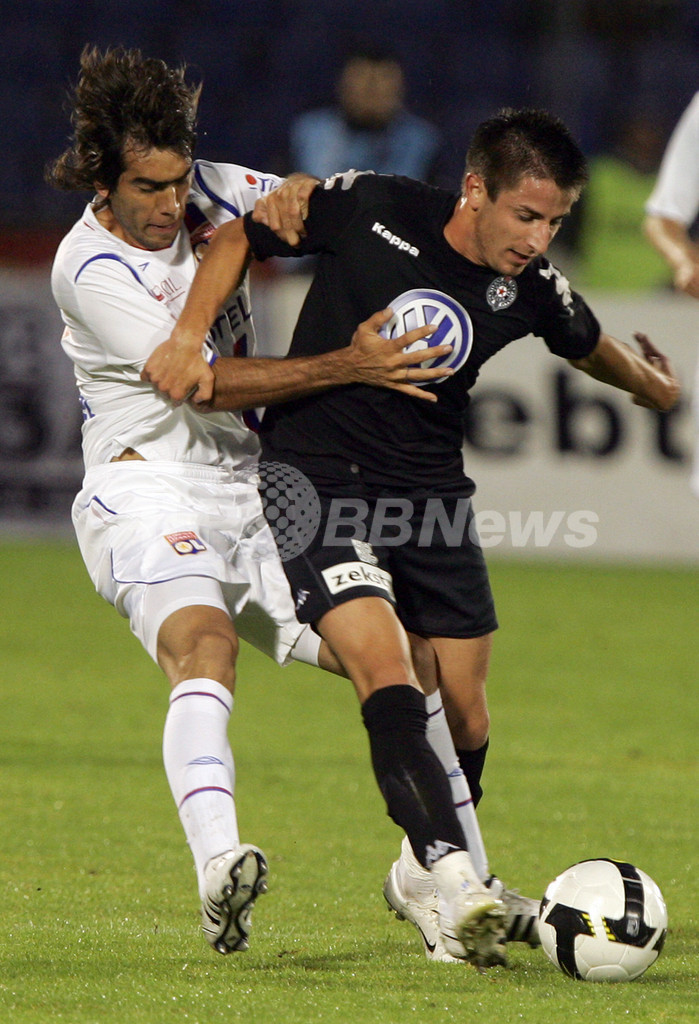 パルチザン・ベオグラードのゾラン・ トシッチ (%%Zoran Tosic%%、右)にプレッシャーをかけるオリンピック・リヨンのセサル・デルガド(%%Cesar Delgado%%、左)。(2008年7月23日撮影)(c)AFP/ANDREJ ISAKOVIC