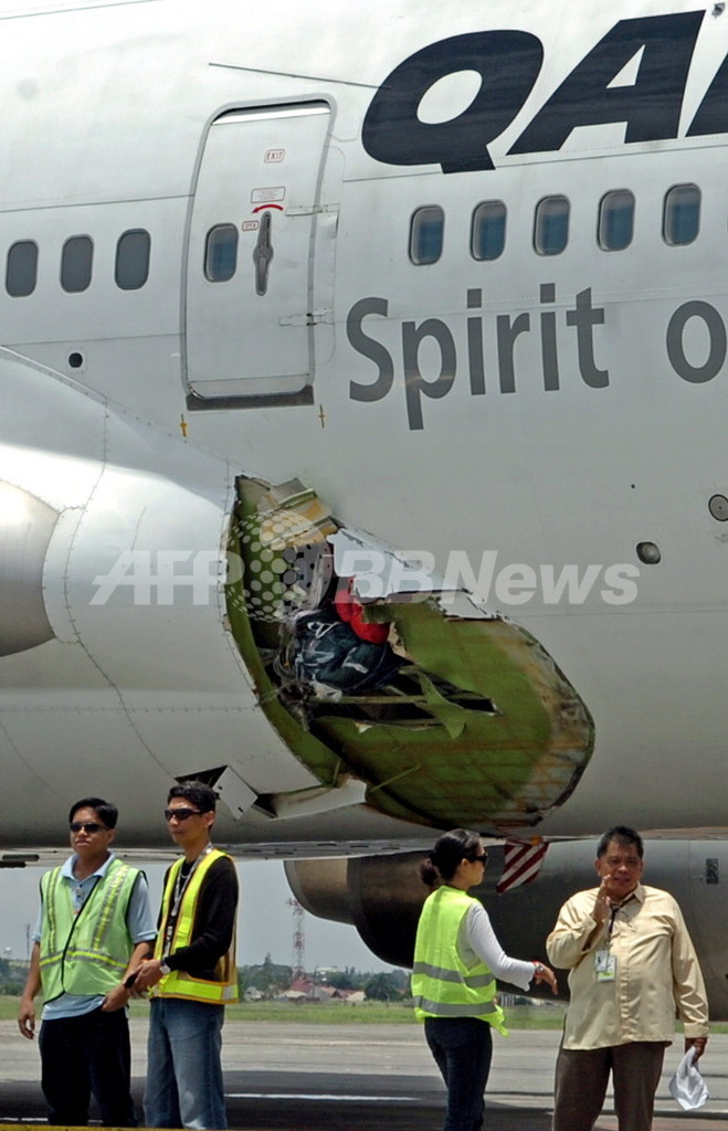同機は25日、香港(Hong Kong)経由でオーストラリアのメルボルン(Melbourne)への飛行中、機体に直径3メートルの穴が開き、フィリピンのマニラ(Manila)空港に緊急着陸。その後の調査で、穴が開いた右翼下部付近に設置されていた酸素ボンベが欠落しているのが発見されたため、カンタス航空はすべての同型機について、酸素シリンダーの緊急点検を実施している。