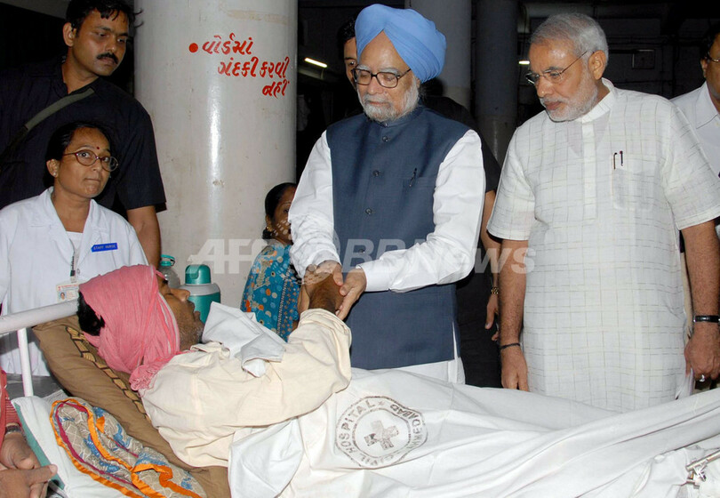 【7月28日 AFP】インドのマンモハン・シン(Manmohan Singh)首相と西部グジャラート(Gujarat)州のナレンドラ・モディ(Narendra Modi)州首相らは28日、同州アーメダバード(Ahmedabad)で発生した16件の連続爆破事件の被害者を見舞った。