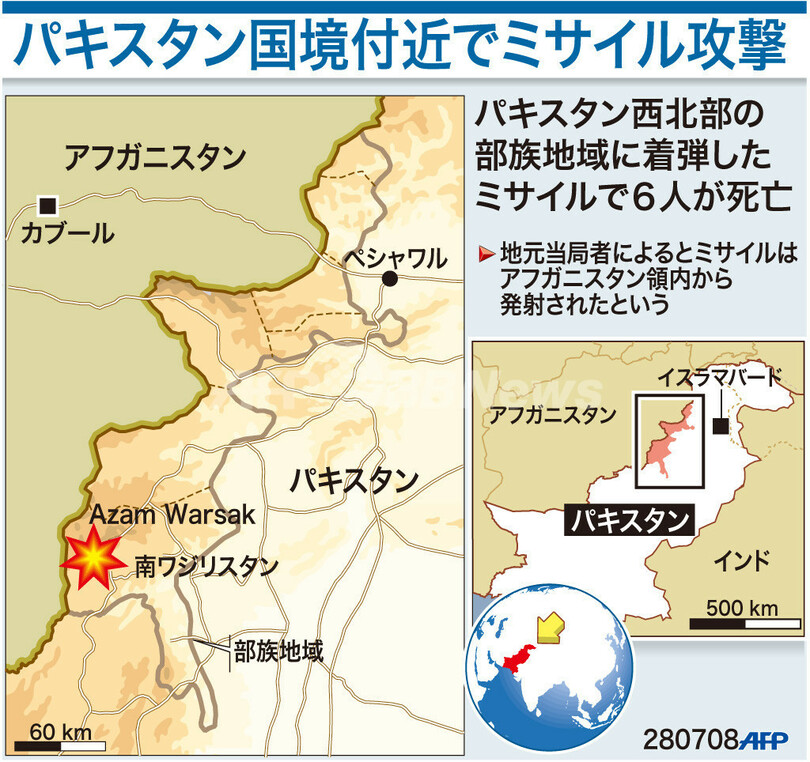 ニュース 戦争・紛争 図解 【図解】パキスタン国境付近でミサイル攻撃 2008年7月29日 23:55 発信地:パキスタン [ アジア・オセアニア パキスタン ] このニュースをシェア (c)AFP 【7月29日 AFP】図は、28日にアフガニスタン領内から発射されたミサイルで少なくとも6人が死亡したパキスタン西北部の部族地域を示したもの。(c)AFP<ニュース解説画像一覧へ> 戦争・紛争 一覧へ> メディア・報道関係・法人の方向け 写真・動画 購入のお問合せ>