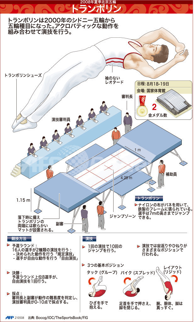 五輪 図解 【図解】北京五輪種目・トランポリン 2008年7月31日 3:20 発信地:北京/中国 [ 中国・台湾 中国 ] このニュースをシェア (c)AFP 【7月31日 AFP】図は、2008年夏季北京五輪の競技種目、トランポリンについて示したもの。(c)AFP<ニュース解説画像一覧へ> 五輪 一覧へ> メディア・報道関係・法人の方向け 写真・動画 購入のお問合せ>