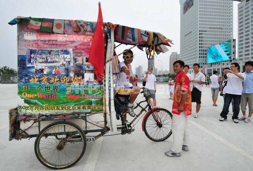 中国南東部の浙江(Zhejiang)省出身のディングオさんは、三輪車に乗って11か月かけて6月上旬に北京市にやって来た。その後は、五輪のロゴをかたどって刈り込んだヘアスタイルとサングラスで注目を集め、市内にある五輪公園(Olympic Green)を訪れる人々の間ですっかり人気者になったという。(c)AFP