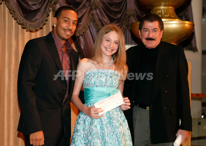 ビバリーヒルズホテル(Beverly Hills Hotel)で開催されたハリウッド外国人映画記者協会(Hollywood Foreign Press Association、HFPA)の昼食会でポーズを取る、(左から)俳優/ミュージシャンのクリス・リュダクリス・ブリッジス(Chris “Ludacris” Bridges)、女優のダコタ・ファニング(Dakota Fanning)、HFPAのJorge Camara会長(2008年7月30日撮影)。(c)AFP/Getty Images/Kevin Winter