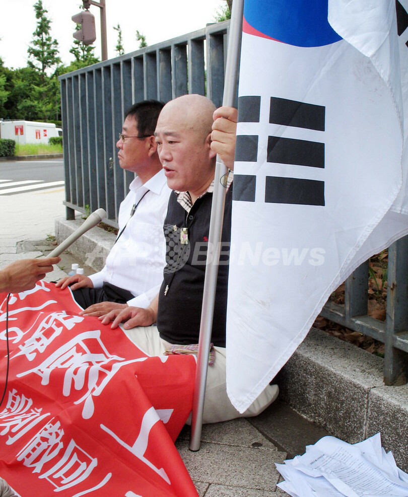 残る2人は抗議活動の続行を許可され、竹島問題に関する福田康夫(Yasuo Fukuda)首相あての公開質問状を配布していたという。(c)AFP