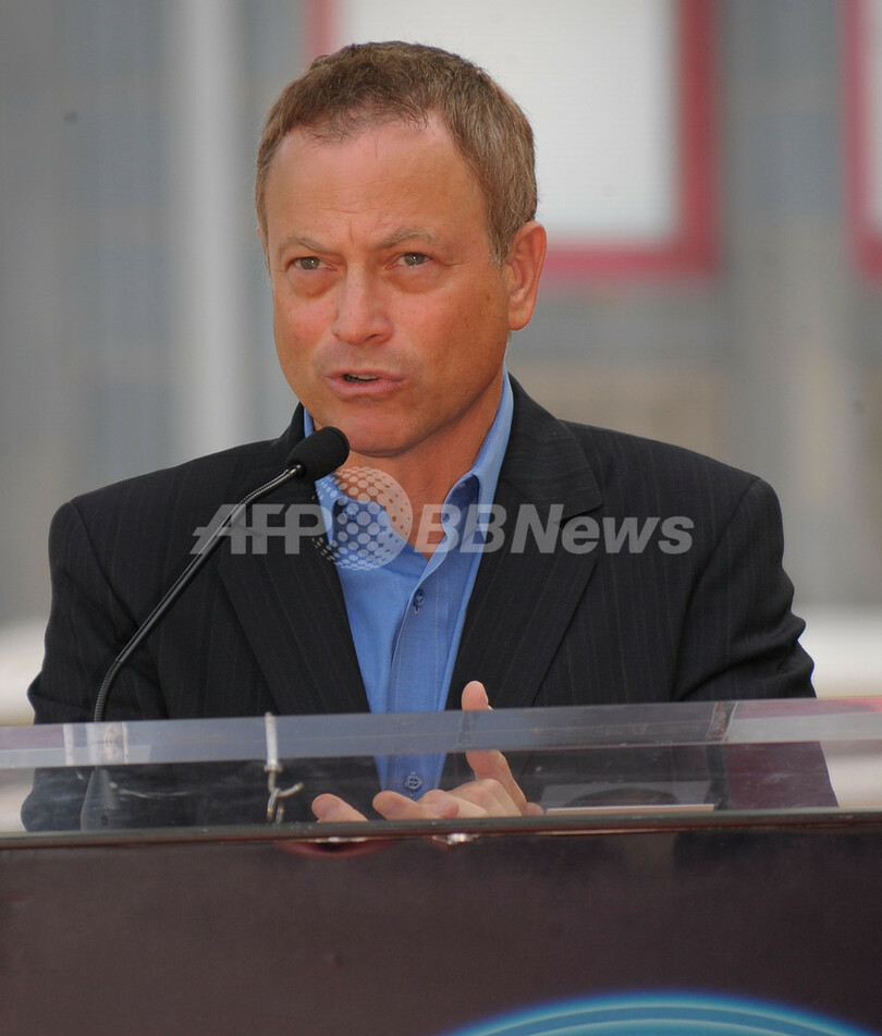 俳優チャールズ・ダーニング(Charles Durning)のハリウッドの殿堂「ウォーク・オブ・フェーム(Hollywood Walk of Fame)」入り記念セレモニーに出席し、スピーチをする俳優のゲイリー・シニーズ(Gary Sinise、2008年7月31日撮影)。(c)AFP/Getty Images/Charley Gallay