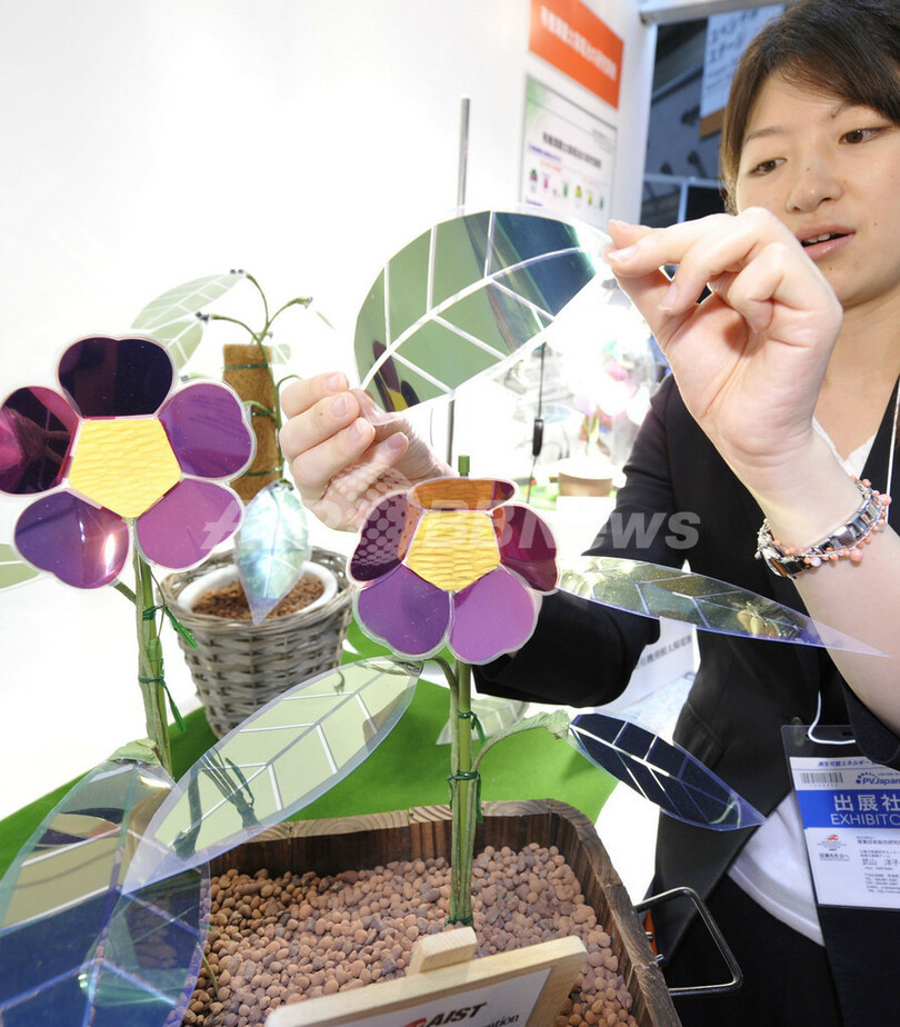 【8月4日 AFP】東京・有明の東京ビッグサイト(Tokyo Big Sight)で7月30日に開幕した太陽光発電に関する総合イベント「PVJapan2008」で、軽量で折り曲げ可能、観葉植物型のデザインを採用した有機薄膜太陽電池の試作品が披露された。