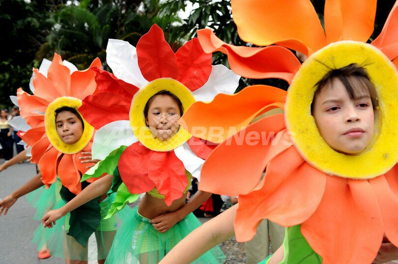 コロンビア北西部アンティオキア(Antioquia)州メデジン(Medellin)で、花の祭典「ラ・フロレスタ(La Floresta)」のパレードに参加した子どもら(2008年8月2日撮影)。(c)AFP/Raul ARBOLEDA