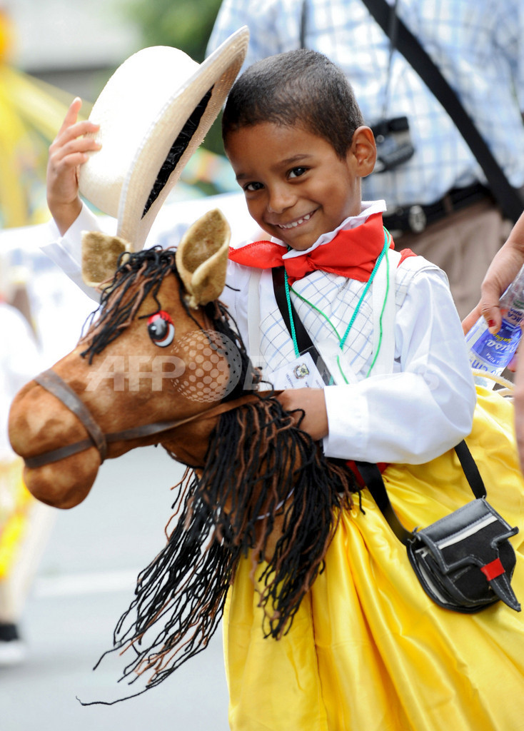 コロンビア北西部アンティオキア(Antioquia)州メデジン(Medellin)で、花の祭典「ラ・フロレスタ(La Floresta)」の子どもパレードに参加する少年(2008年8月2日撮影)。(c)AFP/Raul ARBOLEDA