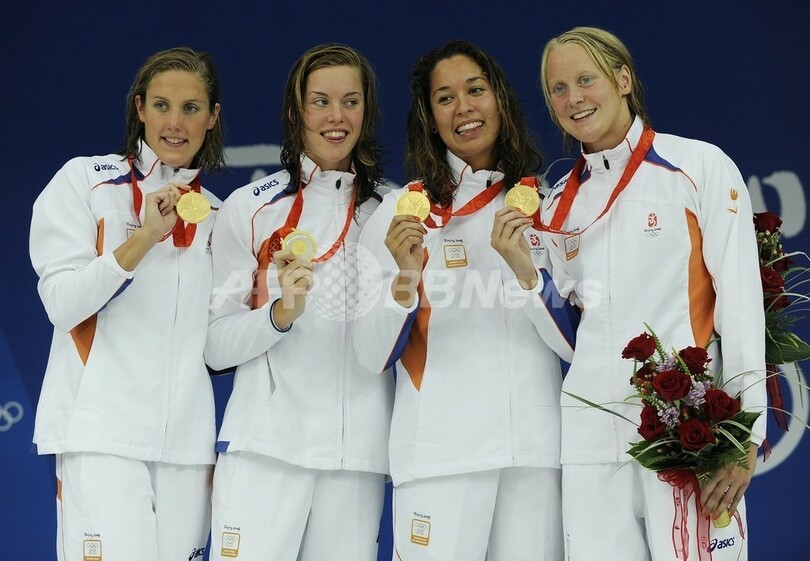 【8月10日 AFP】北京五輪第3日、競泳・女子4x100メートルリレー決勝。オランダは、五輪記録となる3分33秒76をマークして金メダルを獲得した。