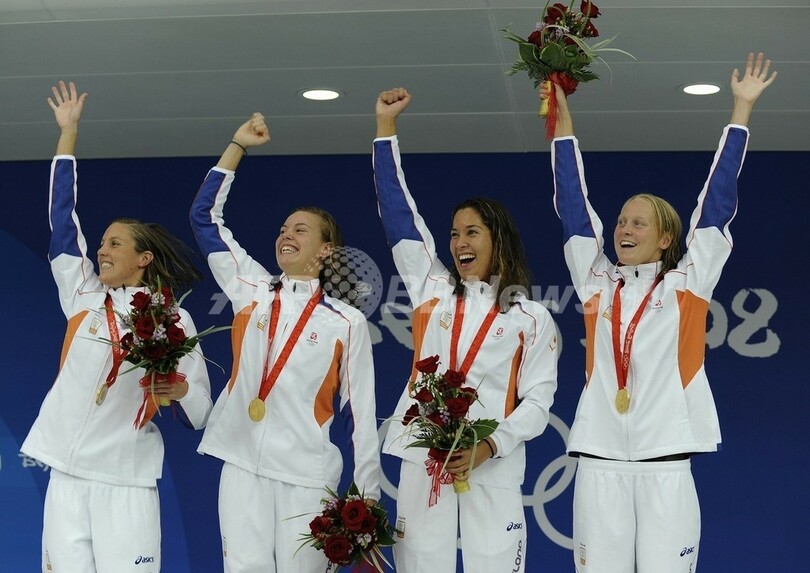 【8月10日 AFP】北京五輪第3日、競泳・女子4x100メートルリレー決勝。オランダは、五輪記録となる3分33秒76をマークして金メダルを獲得した。