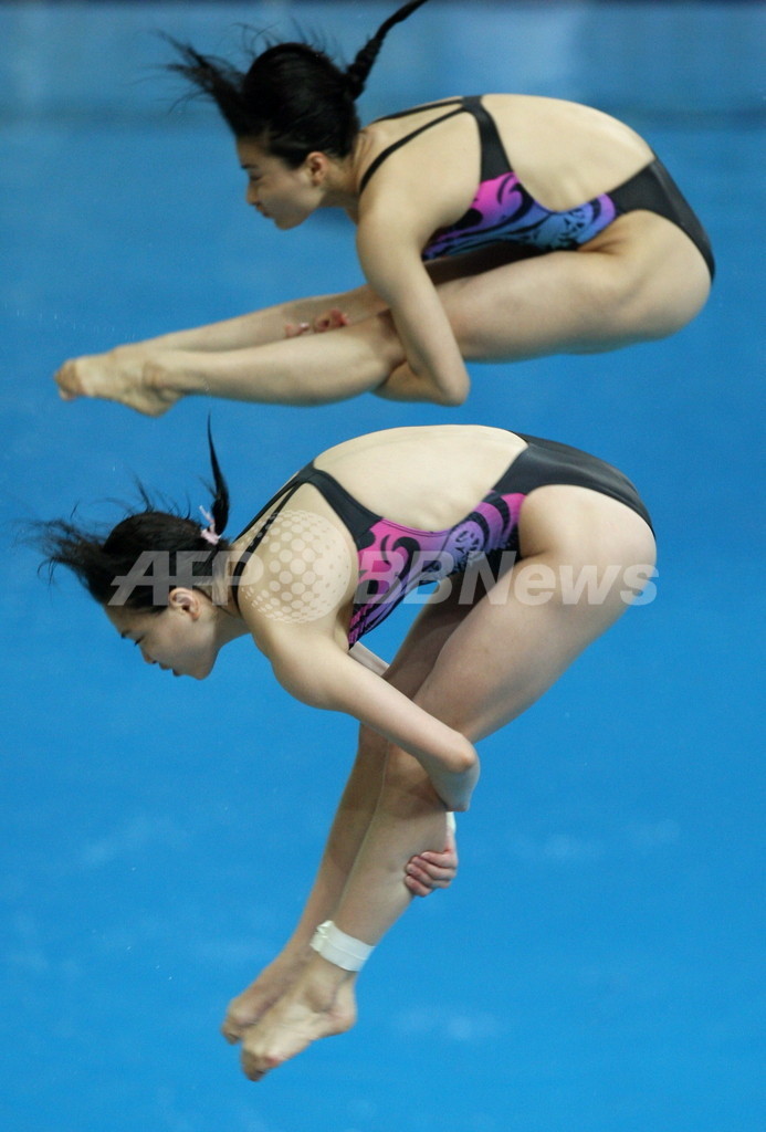 【8月10日 AFP】北京五輪第3日、飛び込み・女子シンクロ3メートル板飛び込み決勝。中国の郭晶晶(Guo Jingjing)/呉敏霞(Wu Minxia)組は、343.50点を記録して優勝を果たし、金メダルを獲得した。2位にはロシアのユリア・パハリナ(Julia Pakhalina)/アナスタシア・ポズニャコワ(Anastasia Pozdnyakova)組が、3位にはドイツのディッテ・コツィアン(Ditte Kotzian)/ハイケ・フィッシャー(Heike Fischer)組が入った。(c)AFP