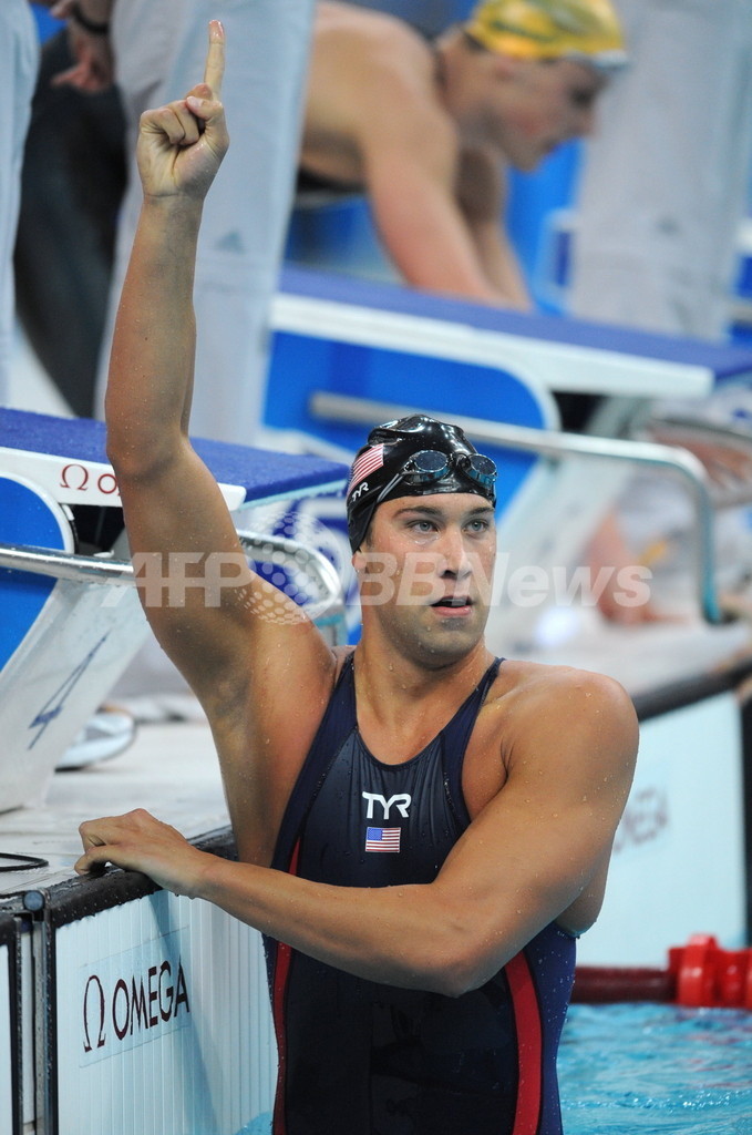 米国チームのネイサン・エイドリアン(Nathan Adrian)、カレン・ジョーンズ(Cullen Jones)、ベンジャミン・ワイルドマン・トブライナー(Benjamin Wildman-Tobriner)、マット・グレイバーズ(Matt Grevers)の4人は、2006年8月カナダのビクトリアで行われたパンパシフィック水泳選手権(Pan Pacific Swimming Championships)で樹立した世界記録3分12秒46を破り、世界新記録を打ち立てた。(c)AFP