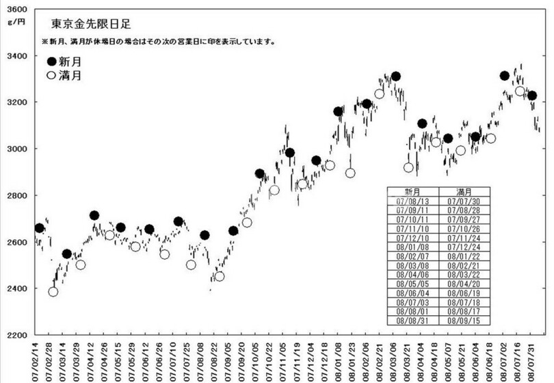 東京金もS安を含む急反落と、オーバーシュート気味に売り込まれている格好だが、ここ数年は、満月前後に安値の節目を付ける傾向が確認されるため、8月17日(日)の満月前後での突っ込み場面では、売り玉の利食いを優先させ、チャートパターンでの底打ち確認後、買いを考える戦略は、どうだろうか? 夏期休暇中の薄商いで値段が飛びやすくなっているが、中長期のファンダメンタルズに大きな変化はない。