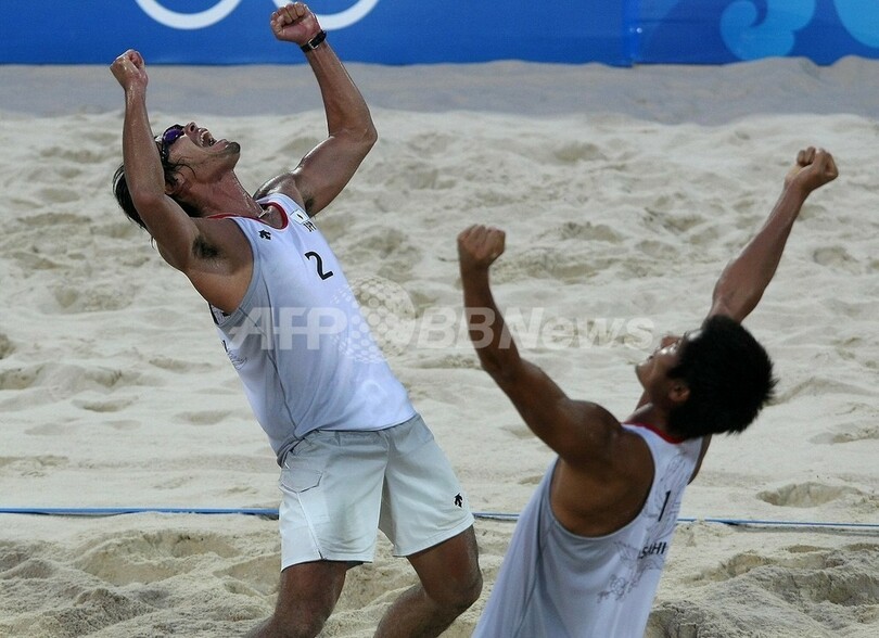 五輪 白鳥/朝日組 フルセットの末オランダを破り初勝利 2008年8月12日 21:14 発信地:北京/中国 [ 中国・台湾 中国 ] このニュースをシェア ‹ › ❮ 2/2 ❯ 勝利を挙げ歓喜する白鳥勝浩と朝日健太郎(右)。(2008年8月12日撮影)(c)AFP/THOMAS COEX 画像作成中 ! 【8月12日 AFP】北京五輪第5日、ビーチバレー・男子一次リーグF組。日本の白鳥勝浩(Katsuhiro Shiratori)/朝日健太郎(Kentaro Asahi)組は、オランダのブラム・ロネス(Bram Ronnes)/エミール・ブルスマ(Emiel Boersma)組と対戦。白鳥/朝日組は、セットカウント2-1(21-15、23-25、15-11)でロネス/ブルスマを下し、初勝利を挙げた。(c)AFP 五輪 一覧へ> メディア・報道関係・法人の方向け 写真・動画 購入のお問合せ>