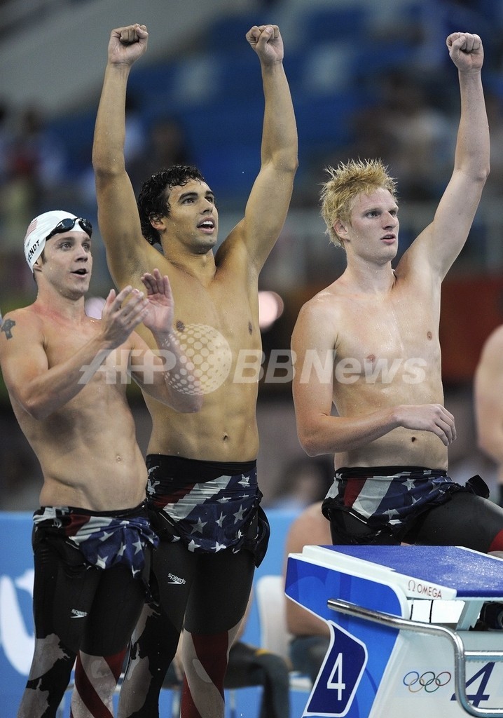 五輪 米国 男子4x200メートルリレー予選で五輪新記録樹立 2008年8月12日 22:54 発信地:北京/中国 [ 中国・台湾 中国 ] このニュースをシェア 第4泳者のクリート・ケラーをプールサイドで応援する(左から)エリク・ベント、リッキー・ベレンズ、デビッド・ ウォルターズ。(2008年8月12日撮影)。(c)AFP/TIMOTHY CLARY 【8月12日 AFP】北京五輪第5日、競泳・男子4x200メートルリレー予選。米国のデビッド・ウォルターズ(David Walters)、リッキー・ベレンズ(Ricky Berens)、エリク・ベント(Erik Vent)、クリート・ケラー(Klete Keller)は、五輪新となる7分04秒66を記録して全体首位で決勝進出を決めた。(c)AFP 五輪 一覧へ> メディア・報道関係・法人の方向け 写真・動画 購入のお問合せ>