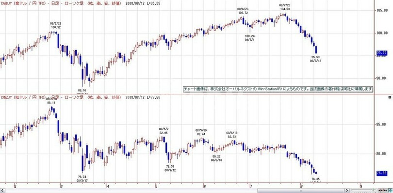 【8月13日 IDO Securities】昨晩は、欧米株が下落する中、円全面高の展開。ドル円は、6月米貿易赤字の予想を下回る結果に対しては反応薄だったが、NY原油が112ドル台まで反落するもののドル円は反発せず、米株価下落に反応する形で109円台前半まで下落となった。先週までの主要通貨の中で『ドルが1番強く、円が2番目に強い』という構造に変化の兆しが出始めている。(対ユーロを含めた)ドルの買戻しが一段落し、円が強くなり始める兆しか??。お盆や8月には、円が上昇し易いという季節性があり、日米金利差が2%以内の時には、その確率は高まっている。FX取引を通じた本邦個人投資家の対AUD、NZDでの円ショート・ポジションがAUD/JPY、NZD/JPYの下落を受け巻き戻され(円の買戻し)ていることも、ここにきての円高要因となっている。