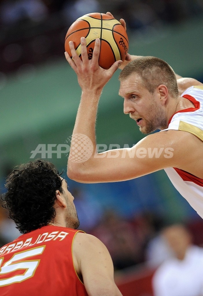五輪 スペイン ドイツ下し3連勝 2008年8月14日 12:35 発信地:北京/中国 [ 中国・台湾 中国 ] このニュースをシェア ‹ › ❮ 3/3 ❯ スペインのホルヘ・ガルバホサ(%%Jorge Garbajosa%%、左)に1対1を仕掛けるドイツのダーク・ノビツキー(%%Dirk Nowitzki%%)。(2008年8月14日撮影)(c)AFP/ANTONIO SCORZA 画像作成中 ! 【8月14日 AFP】北京五輪第7日、男子バスケットボール・グループリーグB、ドイツ対スペイン。試合はスペインが72-59でドイツを下し、3連勝を飾った。(c)AFP 五輪 一覧へ> メディア・報道関係・法人の方向け 写真・動画 購入のお問合せ>